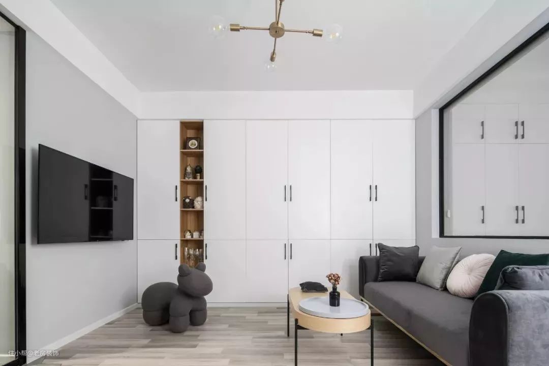 客厅位于餐厅的另一侧,迷你的茶几让空间更显宽敞。在客厅的一侧做上了嵌入式的到顶柜子,给这个小窝增添了不少的储物空间。