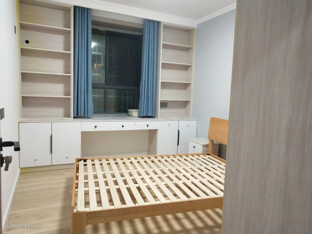 柜子都是全屋定制的,质量与细节都处理很好,而且原木色的柜子,给人一种更大自然,更环保的感觉。选择安装了蓝色的窗帘,真心不错。