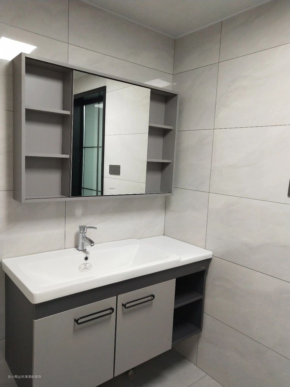卫生间把浴室柜分开出来,安装了非常实用的柜式镜子,可以适当增加一些储物空间,非常实用。颜色都是一样的,并水槽开口比较大,方便使用。