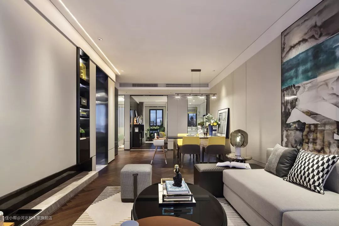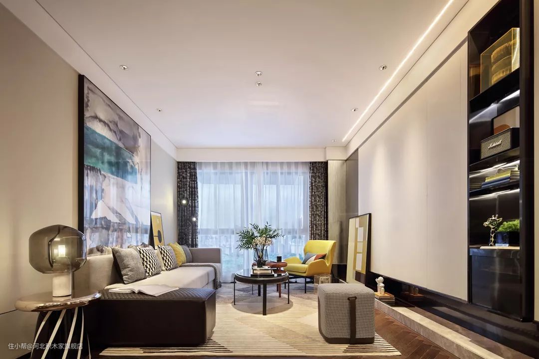 ▲ 沙发背景墙则挂了一幅大型抽象装饰画,搭配浅灰色布艺沙发和黑色椭圆形钢化玻璃台面茶几,艺术感和精致感都很到位。