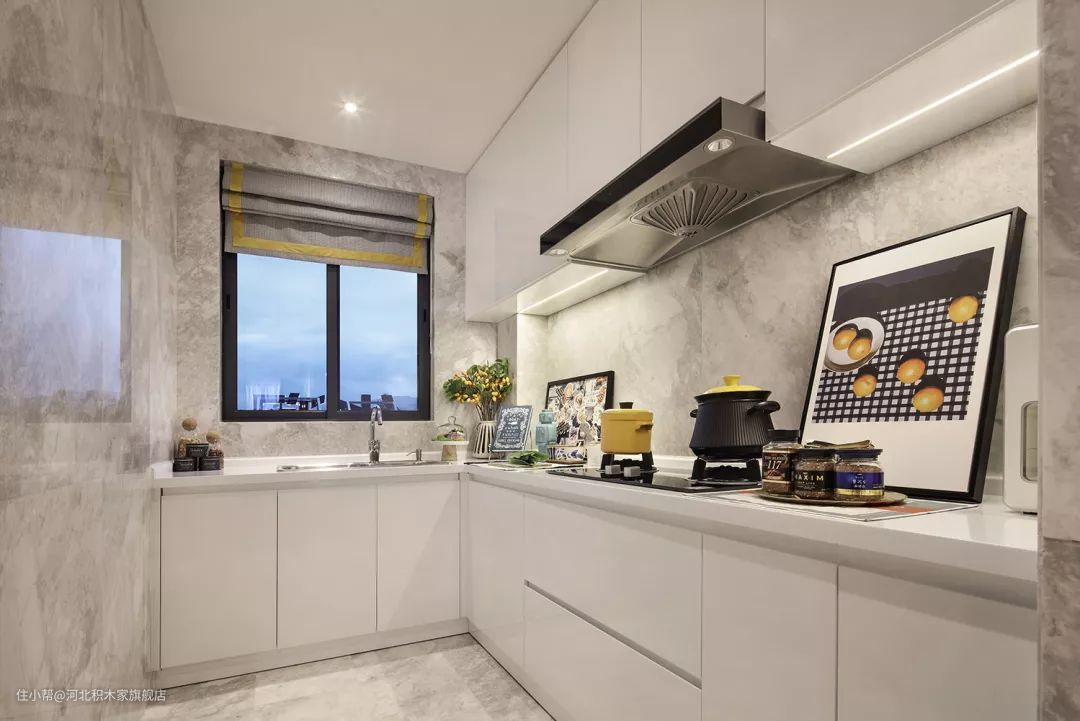 ▲ 厨房以浅灰色调为主,墙地面使用了同一种瓷砖,视觉上具有拉伸的效果。白色的定制橱柜,吊柜底部暗藏灯带,整个空间显得简洁优雅,做饭氛围闲适而有档次。