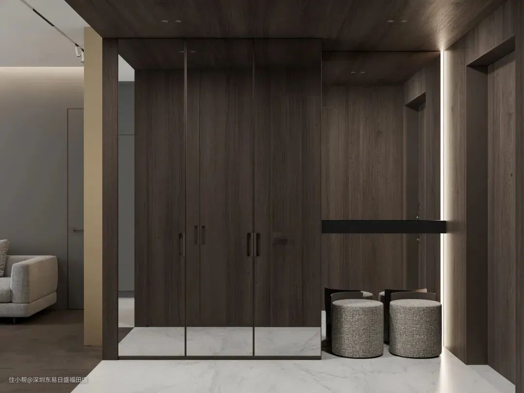 对于大户型的门厅来说,门厅坐凳可以和衣柜、鞋柜有效结合,漂亮的嵌入式柜体,能很好地安放冬日脱下来的外套和鞋子。
