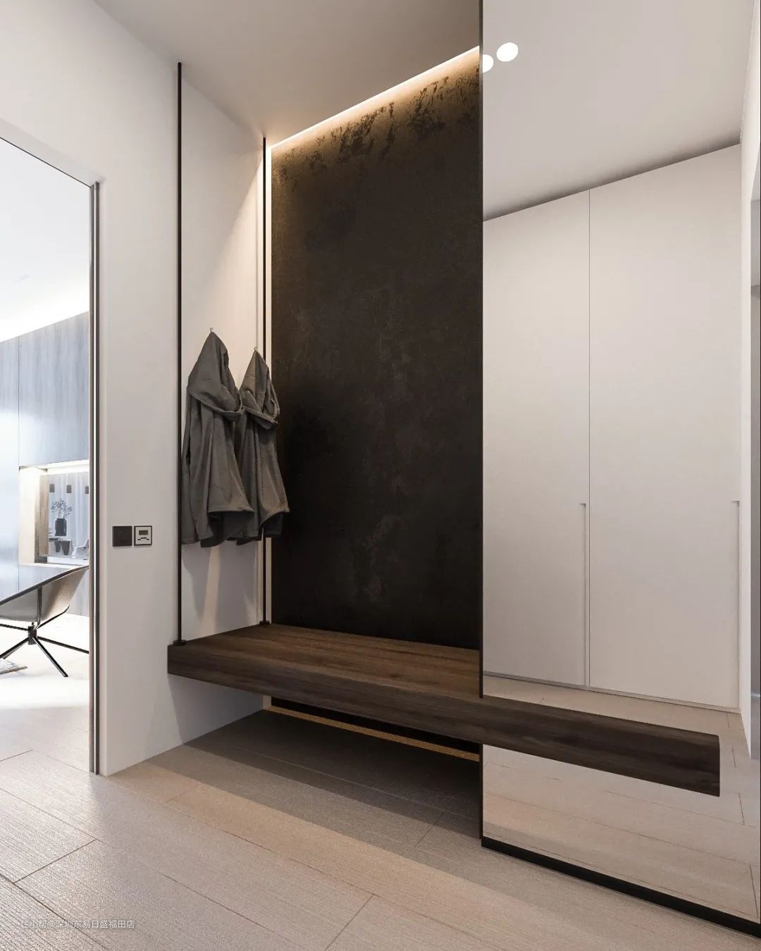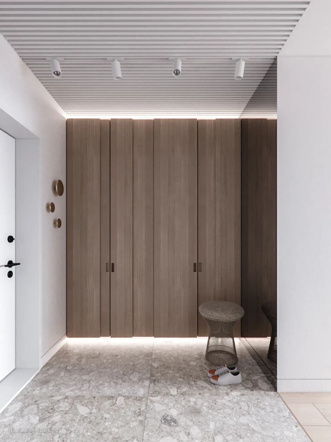 整齐、有效的门厅收纳才是关键,选择白色或者原木色,把鞋柜、衣帽架,以及室内门等都定制成隐蔽式,一体化的设计形式,整体的设计效果更高级。