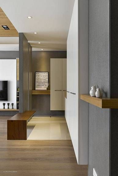 局部衣帽墙设计大多数行色匆匆的上班族,回到家后做的首件事,便是脱掉外套、卸下包包、换上柔软舒适的家居鞋,尽可能地让自己回归放松自在的感觉。