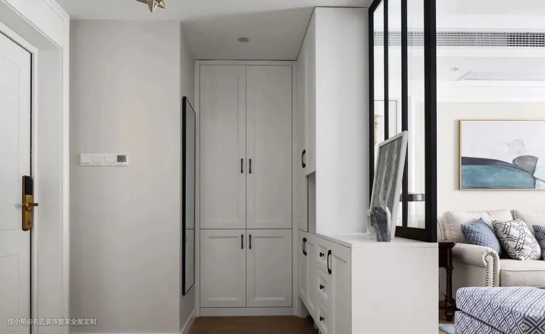 自己造个玄关区域,比如在入户区域做个隔断,也可以带有鞋柜功能。隔断的风格要和家里的装修风格融为一体。