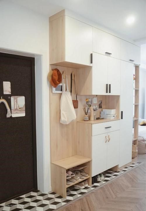 可以沿着垂直于入户门的墙面做一排鞋柜,要是入户门是内开,能改成外开比较好,这样节省室内空间;要是入户门位置到了墙角,厚度不够做鞋柜的话,就选比较薄的成品鞋柜;再要不行,在墙面能敲的情况下,就敲墙吧,然后把鞋柜嵌进去。