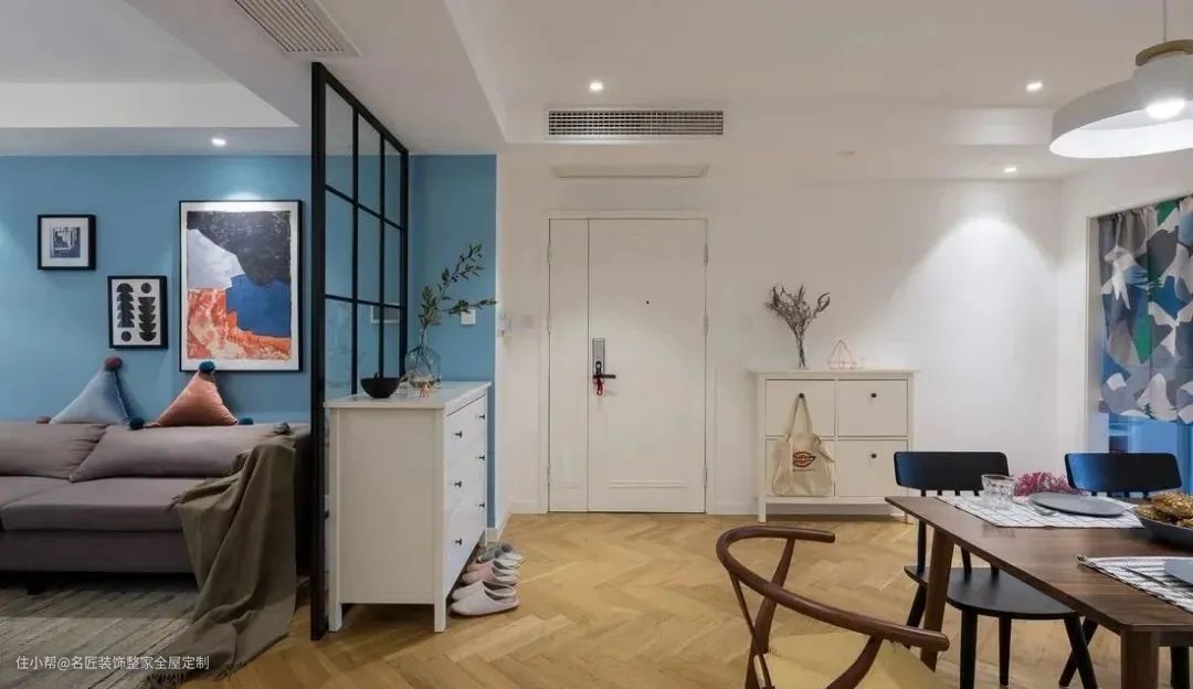 进门就是餐厅/厨房/客厅,其实【无玄关】户型还挺常见,想要设计玄关,有2种方法: