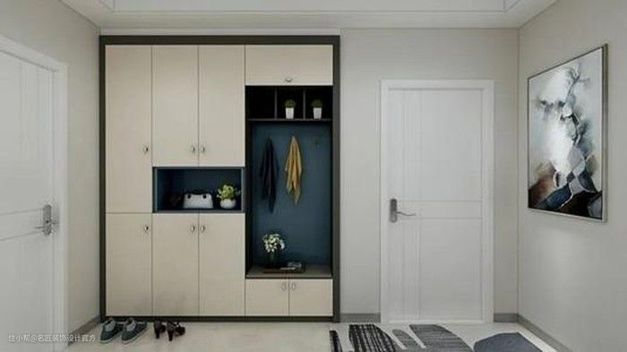 可以沿着垂直于入户门的墙面做一排鞋柜,要是入户门是内开,能改成外开比较好,这样节省室内空间;要是入户门位置到了墙角,厚度不够做鞋柜的话,就选比较薄的成品鞋柜;再要不行,在墙面能敲的情况下,就敲墙吧,然后把鞋柜嵌进去。
