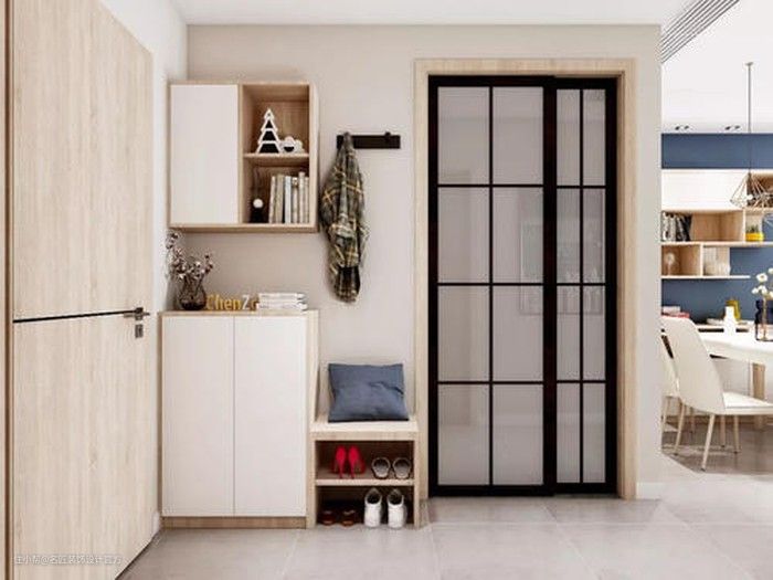 自己造个玄关区域,比如在入户区域做个隔断,也可以带有鞋柜功能。隔断的风格要和家里的装修风格融为一体。