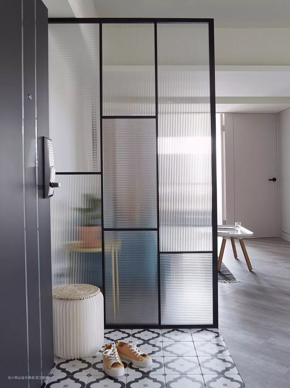 一进门就能看到客厅或者餐厅的户型,可以在玄关位置用长虹玻璃隔断,既能阻挡别人窥探的视线,还可以起到「遮而不挡」的作用,保证空间的通透性~