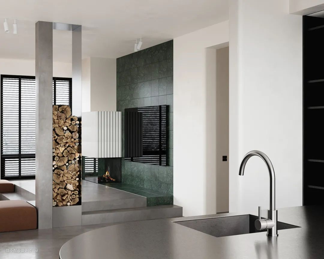 简约的设计风格,质朴的材料,诠释了现代建筑与自然的完美融合,柔和的光线穿过百叶窗,自然流露。客厅中运用墨绿色作为电视背景墙,自带一股复古风情,真的是超级舒适。