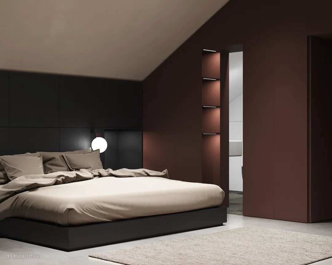 卧室作为人们休息的地方,整体装潢配色不宜太过张扬,设计师加入莫兰迪色系,让卧室看起来温暖舒服,又能尽显高级感。