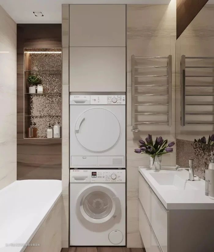 洗衣机设计在洗漱台下,这样排水非常方便,洗漱台可以按照洗衣机的尺寸先定制好,还可以顺便再做一个收纳柜。