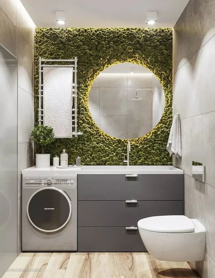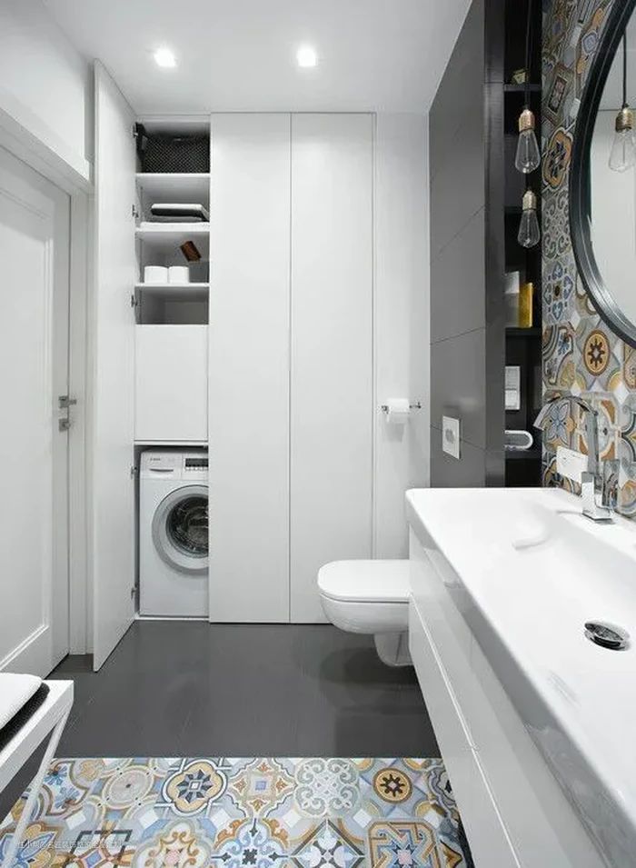洗漱台下面放柜子或洗衣机,能让空间得到很大的利用,而且平时洗漱之后,直接把要洗的衣服丢进去也很便捷,洗衣机放卫生间蓄水、排水都很方便。