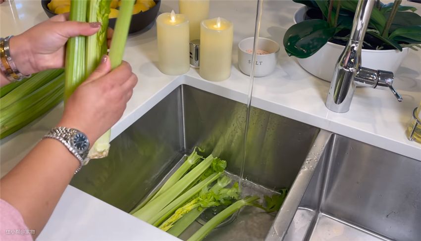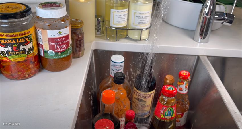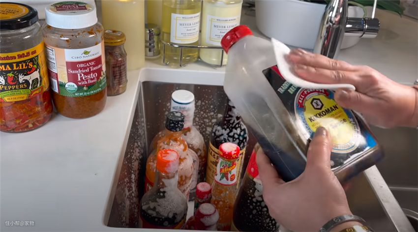 之前放在冰箱内的各种瓶瓶罐罐食材,全都放入水槽内统一清洗,然后用纸巾擦干净。
