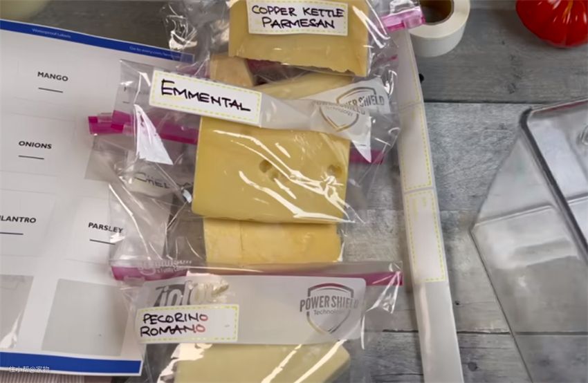 肉食、奶酪则打包放到保鲜袋中密封好,随时备用,为了区分品类,将标签贴在封口处,便于寻找。
