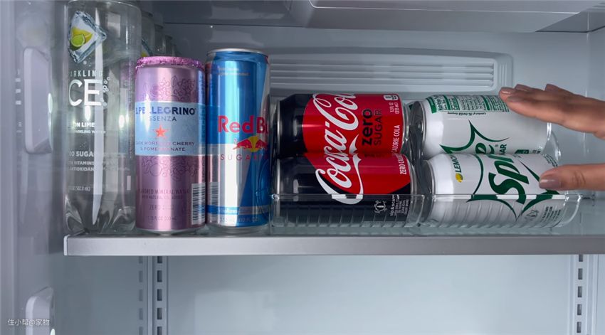 饮料以及各种零食按照顺序依次摆放在冰箱储物盒中,整洁干净,井然有序。