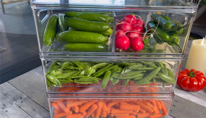 蔬菜水果等备用食材,清洗、切好后,放入保鲜盒中存放,以便于将零散食材整理到一起,保持新鲜干净,平时取用也会更便捷。