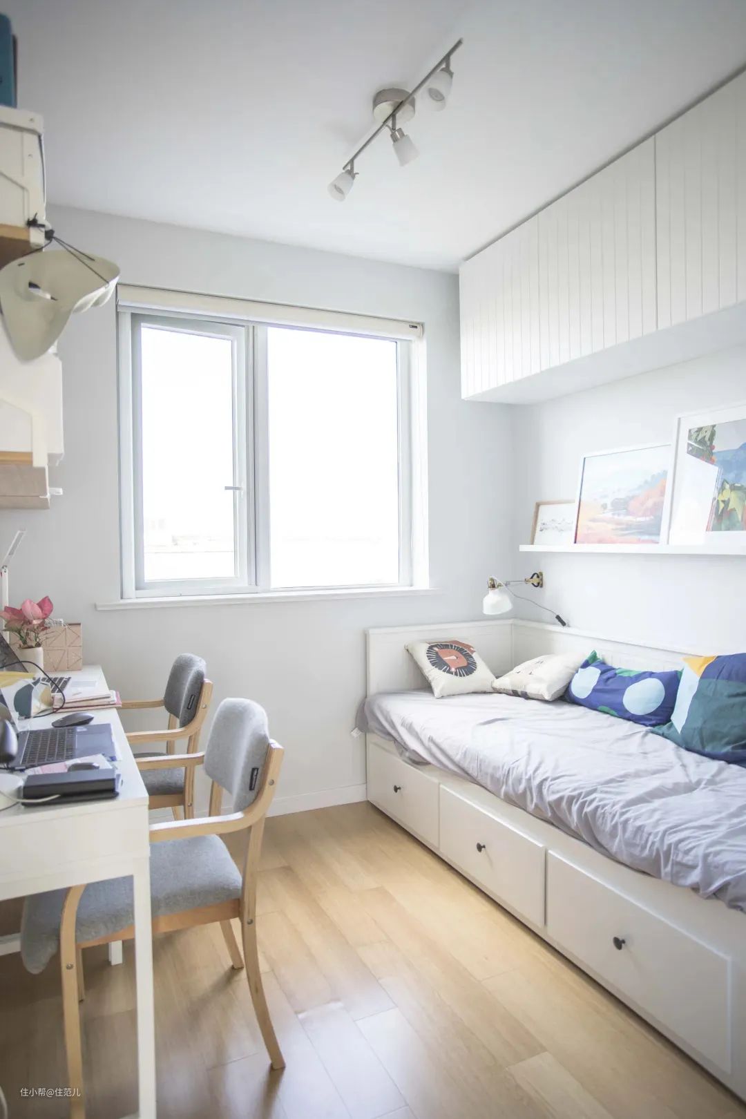 上方搭配了吊柜,墙面做了储物搁板、装饰画,还配了省空间的小壁灯。空间虽小,但整体清爽的浅色搭配,有很舒适的北欧风感受。