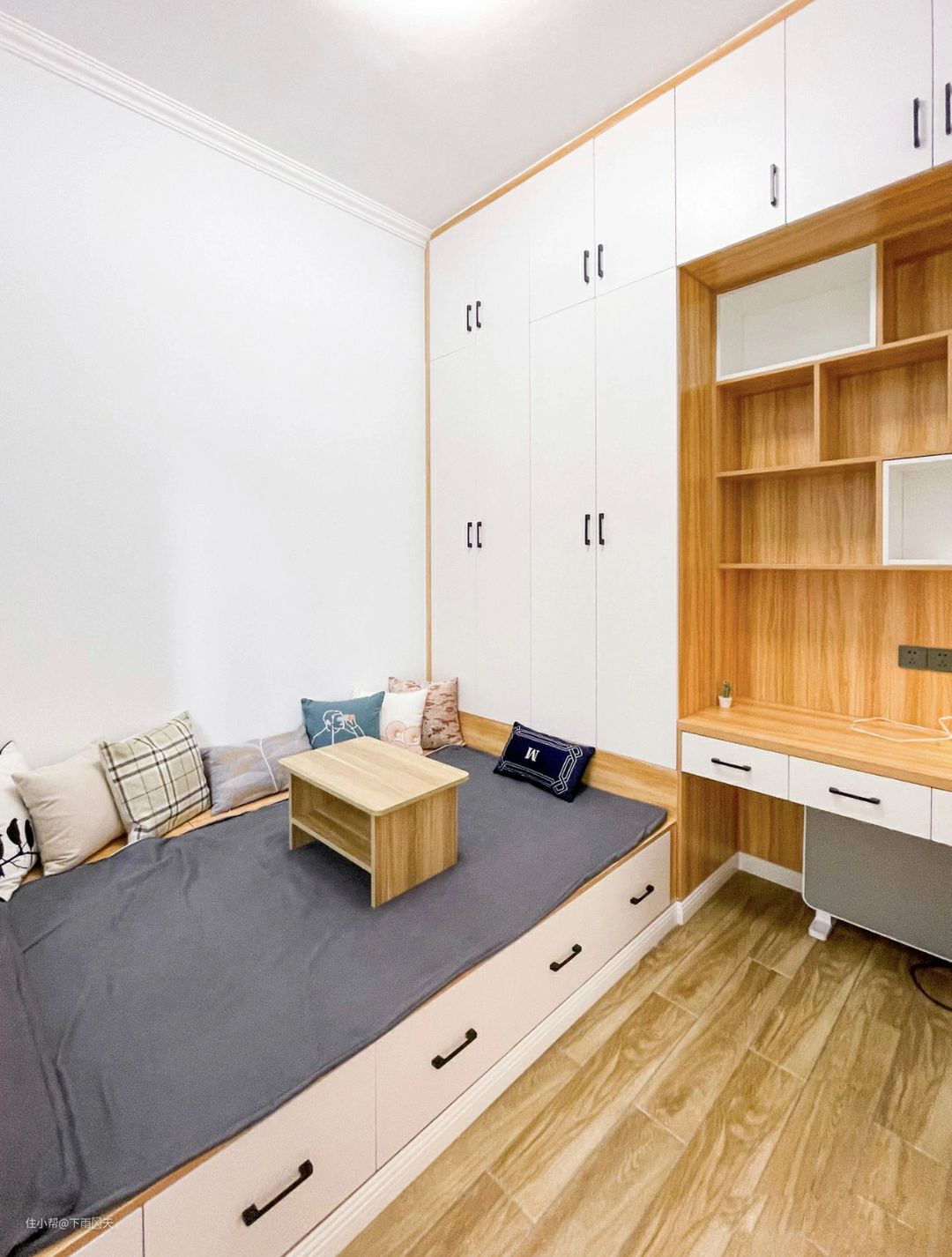 书房考虑到实用性,空间也比较小,所以定制了非常实用的榻榻米,可以提供大量的储物空间。榻榻米刚好把仅有的空间利用起来,可以将空间最大利用化,真心不错哈。可以方便南屋主使用,也方便家里小孩在这里写作业或者看书。平时家里来客人了,可以放客房使用。不过,儿童房没有分享出来,效果其实是一样的哈。