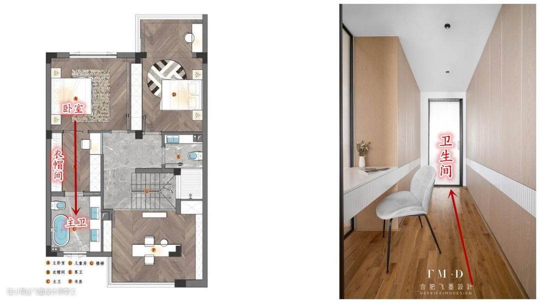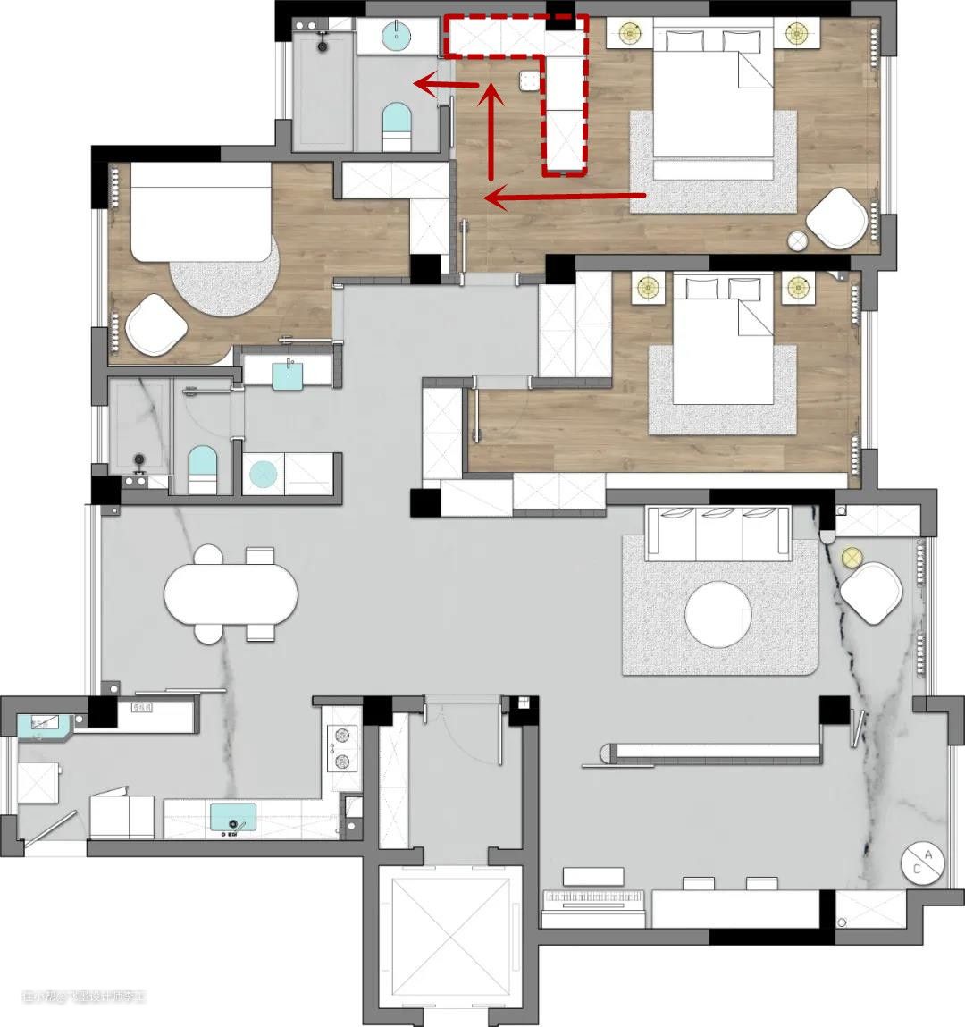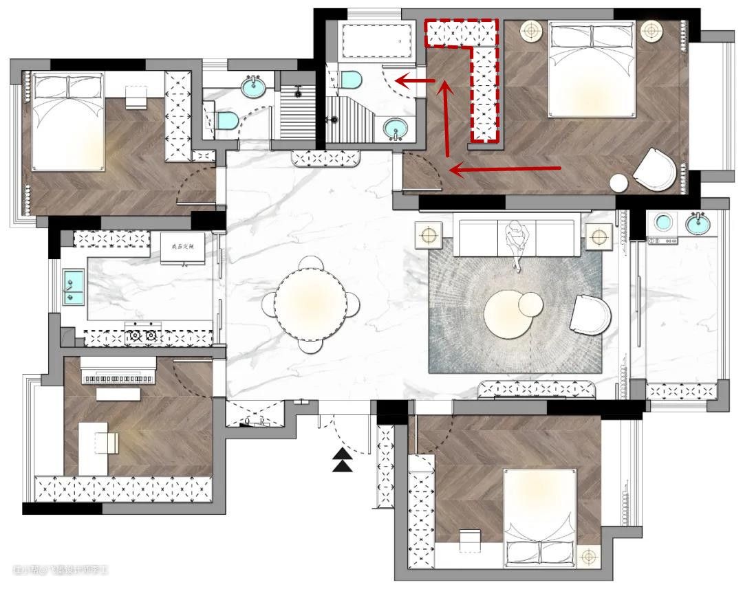 这种是最常见的布局,卫生间在卧室门口,由于是主卫,所以不用担心私密性不好,但是干湿分离一定要做,还能安装个浴缸,晚上可以泡澡放松一下,空间允许的话还能设计双台盆设计,夫妻俩早起可以一起洗漱,效率高。