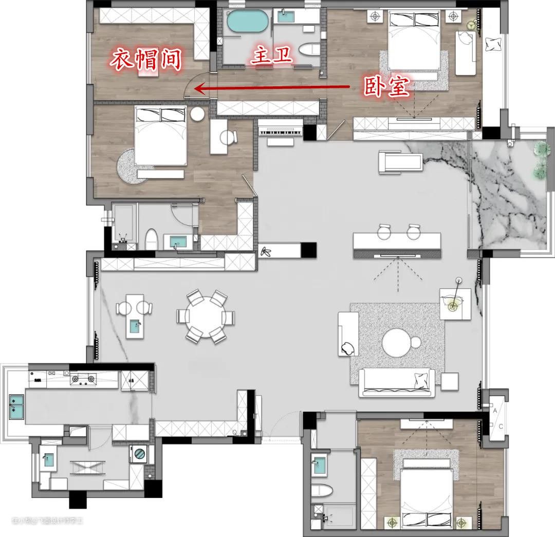 还有一种卧室布局是卫生间在过道处,它连接了卧室和衣帽间,平时早上起来洗漱完就能进入衣帽间换衣服非常方便,布局也很合理,衣帽间和卫生间中间最好加扇门做好防潮措施就可以了,这种比较适合空间很大的卧室布局。
