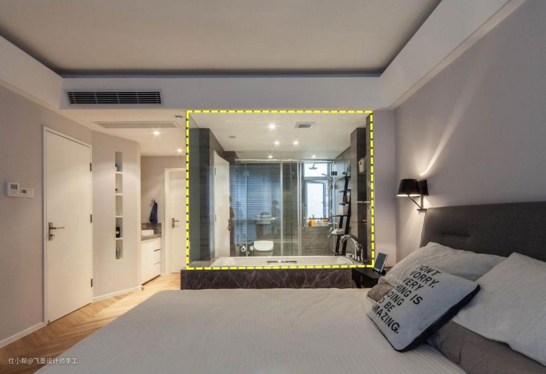 有将洗漱台外移的,也有用透明玻璃做隔断的,前者夫妻俩早起洗漱上厕所互不干扰非常方便,而后者能避免墙壁带来的压缩空间感,可以保持通透感。