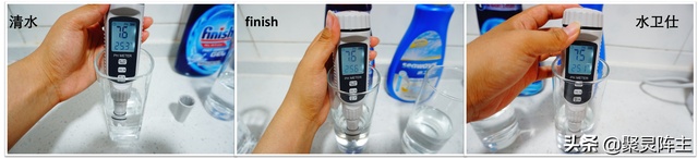 阵主测了一下这两者洗后的餐具装满清水后的pH值,与阵主手动清洗干净的水杯装的清水的pH值相比较,几乎没有差别,可见以pH为评判标准的话,二者确实都没有残留。