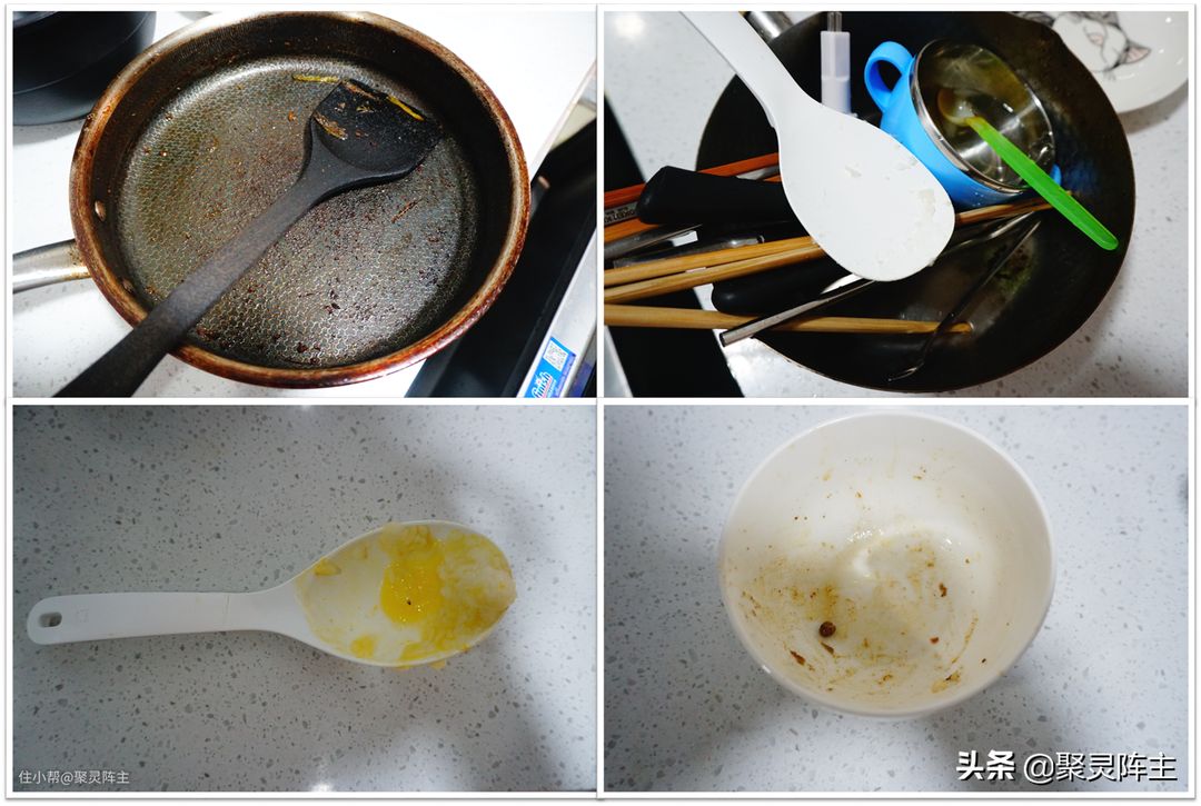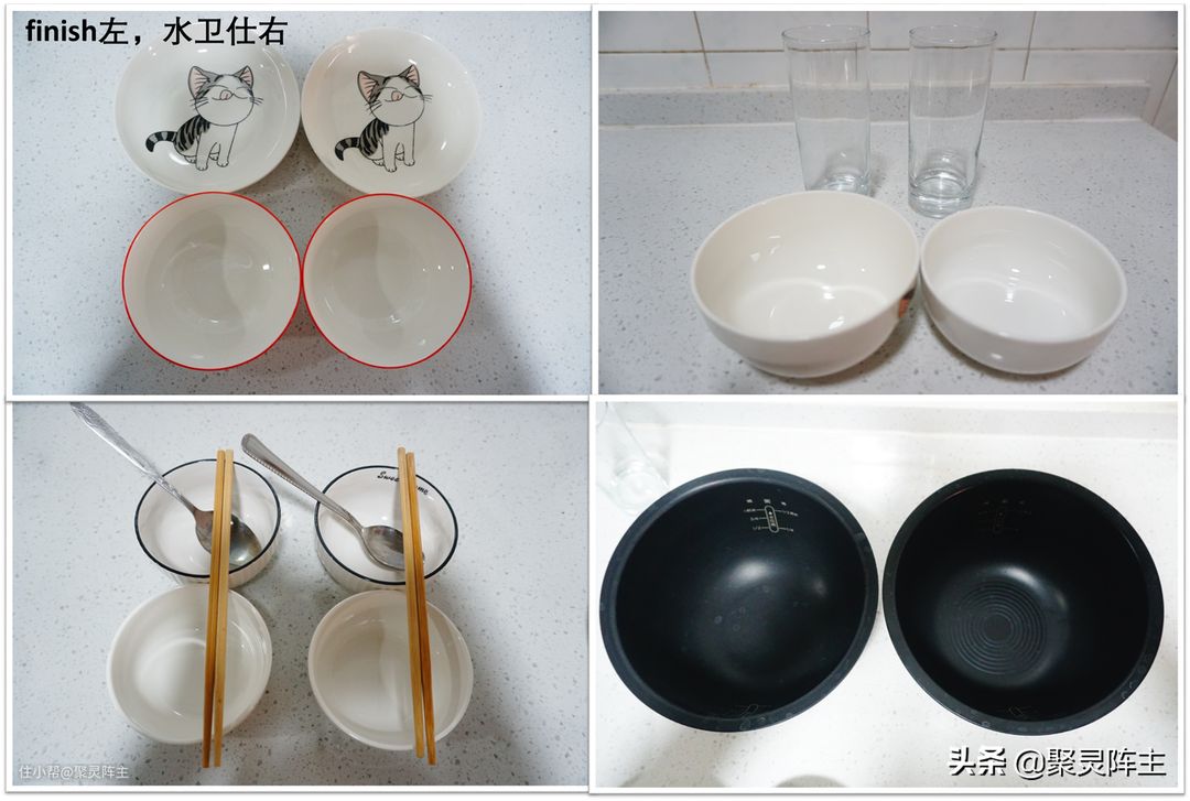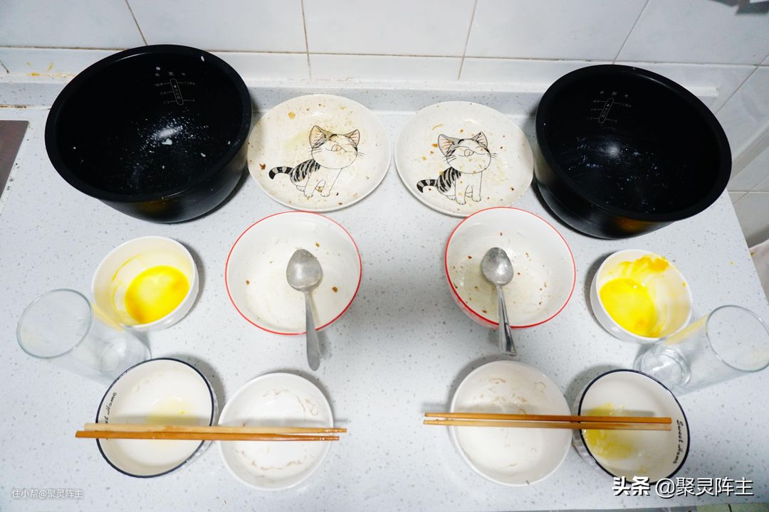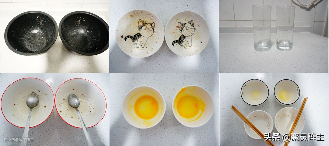 接下来看一下二者的清洗能力对比。阵主特意准备了2套相同的餐具,其脏污程度和使用过程都是一样的,绝对能保证公平且平行对比。这些餐具包括煮饭后粘满干燥米汤的电饭锅内胆,布满油污的盘子和大碗,沾满鸡蛋液的小碗,吃饭后的脏碗,脏勺,筷子以及用脏的玻璃杯。