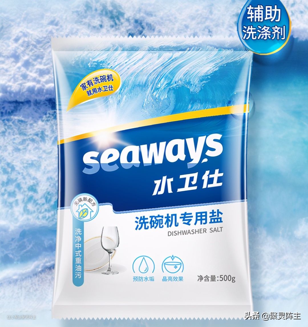 洗碗机所用的清洁用品主要包括洗涤剂,软水盐和漂洗剂。洗涤剂因为种类比较多,成分也稍微复杂一些,所以放在最后讲,我们先来简单说一下软水盐和漂洗剂。软水盐是放在洗碗机软水器中的盐,其作用是软化水质,防止水中的金属离子形成水垢,对机器造伤害。软水盐的主要成分是高纯度氯化钠,很多洗碗机耗材的品牌都有软水盐。软水盐的制作工艺并不是很复杂,所以无需购买昂贵的进口品牌,国产的质量就很好,比如国产的水卫仕,用起来效果就很好。