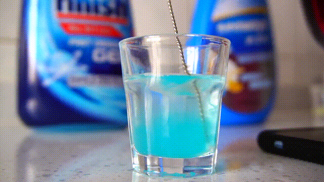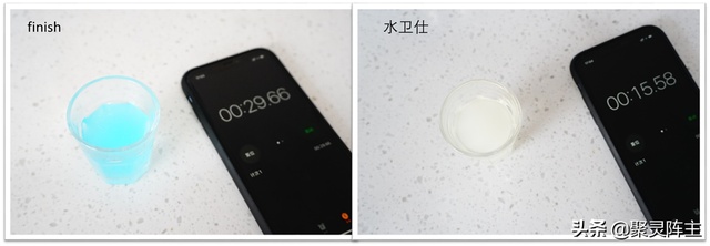 都说洗碗液最大的优势是它溶解速度非常块,阵主特意取了相同量的洗碗液,加相同量的水,用相同的搅拌速度测试这两款洗碗液的溶解速度。结果表明,10g的洗碗液完全溶解在相同量的水中,finish所用的时间为29.66秒,水卫仕所用的时间是15.58秒,可见水卫仕的溶解速度更快一些。