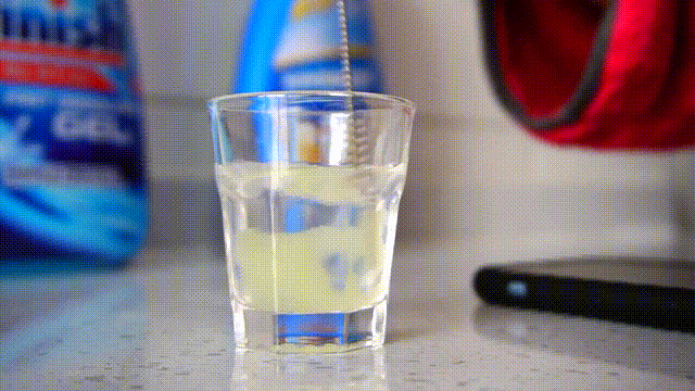 接下里我们来看一下这两款洗碗液的性状。finish和水卫仕的都是比较粘稠的胶状液体,finish的为蓝色,水卫仕的为黄绿色;阵主闻了一下这两款洗碗液的味道,finish的很香,但是有些刺鼻,可能是为了去除餐具异味加了非常多的香味剂;而水卫仕的味道比较正常,是橙子的香气,可能是因为加了甜橙油。