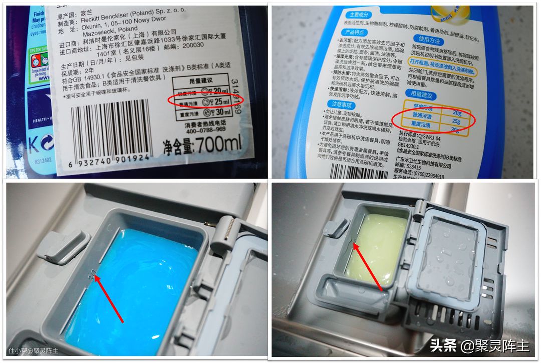 由于二者规定的普通油污的洗碗液用量都是25mL/25g,所以就在洗涤剂仓装入了25mL的洗碗液。