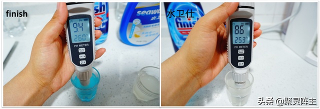 之后分别检测一下溶解后的洗碗剂溶液的pH'值,一般碱性稍强一些的会有更好的油脂水解性能,但是又不能太强,容易破坏餐具,一般8到10之间就可以了。从下面的pH检测结果看,finish的pH值为9.4,水卫仕的为8.6,finish的碱性稍微强一些,但是都属于偏碱性的。