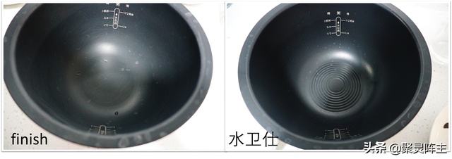 由于阵主家的软化盐没有了,所以电饭锅内胆上还占有一些白白的水渍,相比之下,finish的水渍更大更多一些,而水卫仕只有小小的水渍,相对更少一些。
