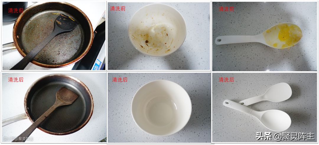 为保证公平与平行,阵主分别采用相同的洗涤程序,在洗碗机中摆放到相同的位置,以及使用相同用量的洗碗液进行洗涤。