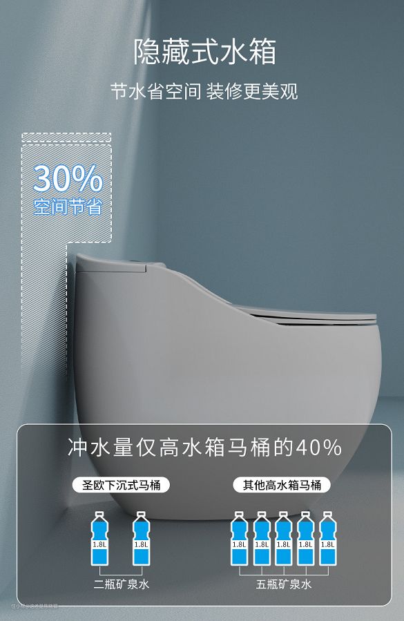 隐藏式水箱,节省了百分之30的空间,装修更美观。每次冲水只需3.6L。