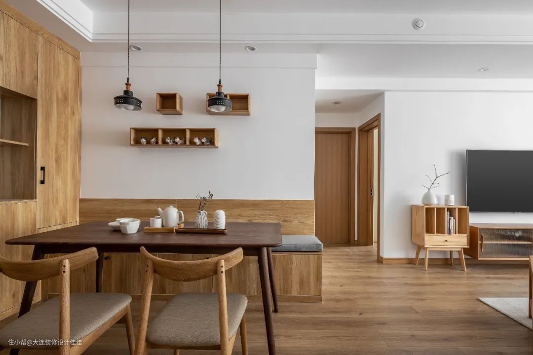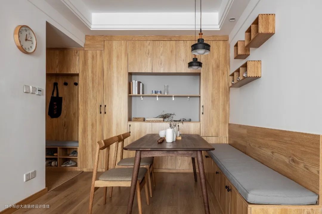 入口后是餐厅,但入口柜与餐边柜相连,整面墙的原木柜收纳功能超强,中间留出空间可放置餐具,也可放置装饰物,看上去更加美观。