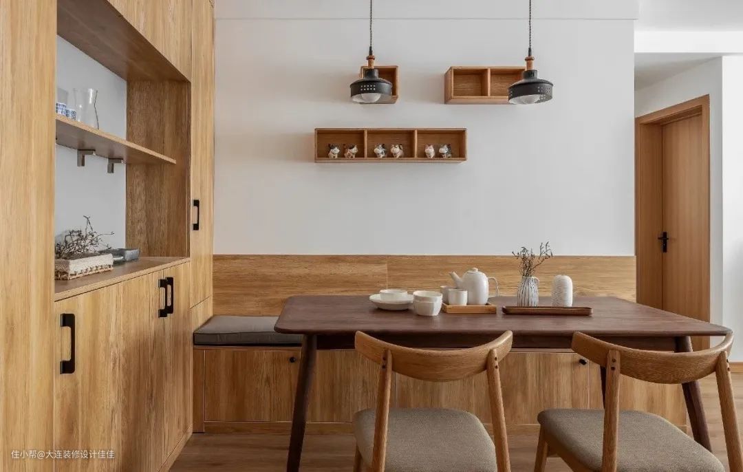 座椅的墙面也做了收纳的格子,放置小装饰品不单调,垂下两盏吊灯营造温暖的氛围,这样的餐厅简单却有质感。