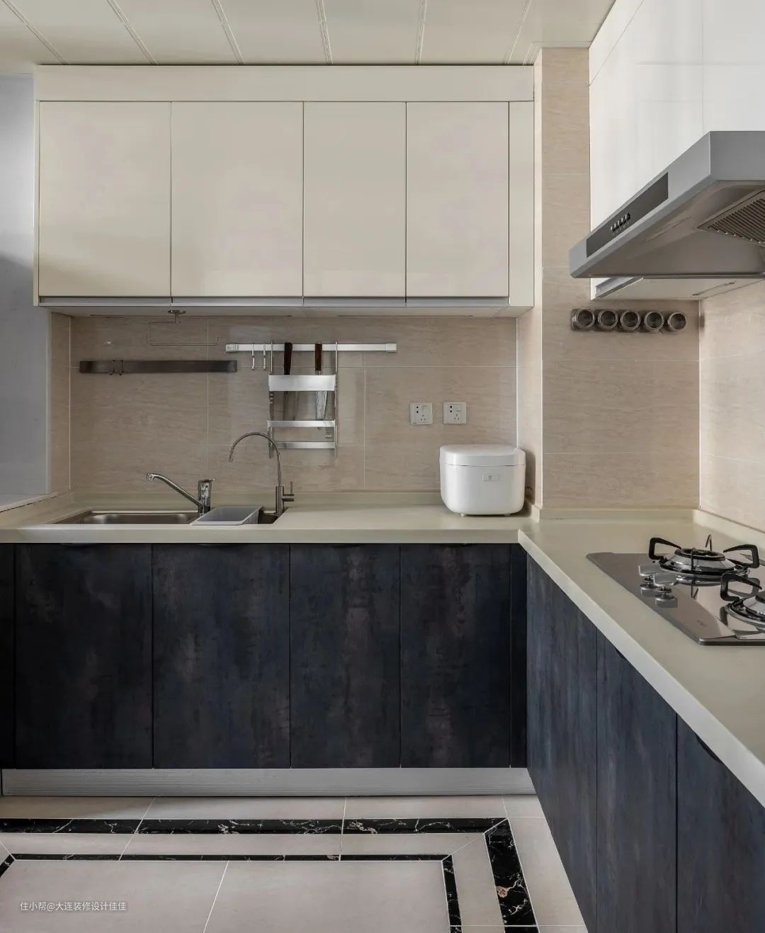 厨房在餐厅后面的空间里,橱柜是L型的设计,橱柜是深色的橱柜是浅色的,上下看起来更有层次感,给人清洁的感觉。