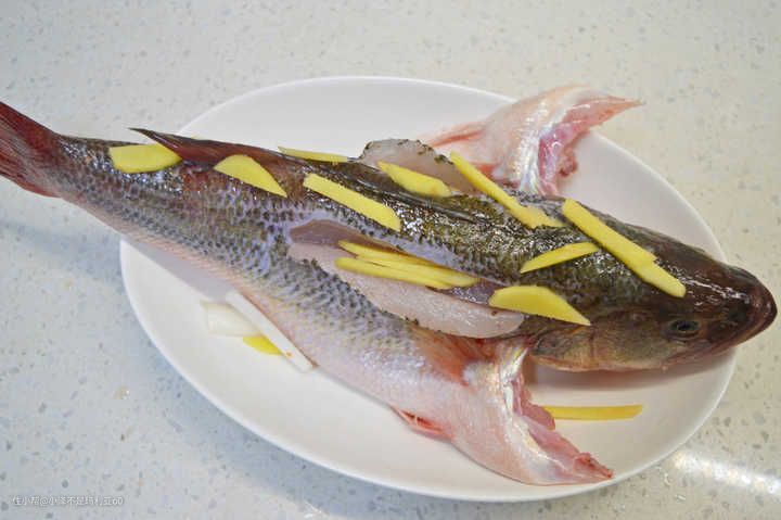 将鲈鱼立起平铺在鱼盘中,盘子底部记得提前铺一些葱姜,然后在鱼肚子和开背处也塞入葱姜,最大程度的去除鱼腥味。