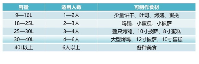 但对于厨房摆放空间不足或者装修时没有预留嵌入式橱柜的家庭,也可以选择25—30L的中型烤箱。这类烤箱对空间的要求更小,烘烤的食材也能满足3—4人食用,更适合你我这样的普通家庭。
