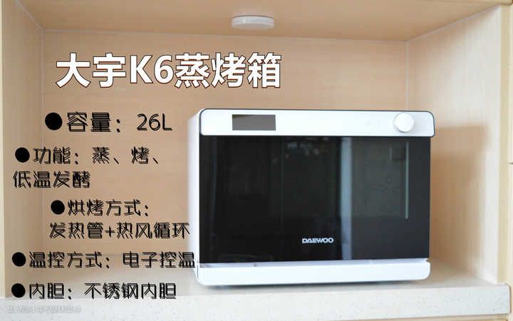 我家目前使用的大宇K6蒸烤箱容量为26升,可以实现三层同时烘烤,适合3—4人的普通家庭。