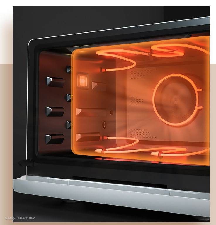 ①目前市面上一些低端或者容量比较小的烤箱通常都只采用了顶部有发热管的形式,由于食物在加热烘烤时只有一面受热,受热不均匀非常容易导致食物夹生的现象,使用体验会比较差。