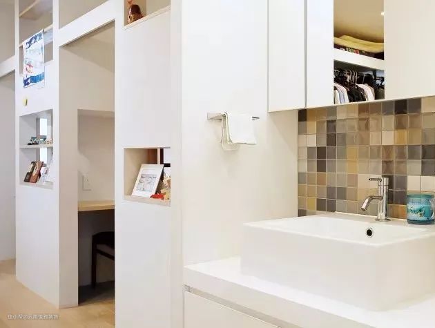 那么,她家洗手台之所以能放在玄关,一方面是上下水的位置不成问题,另一方面离厕所和卧室都很近,相比家里其他地方,把洗手台设计在这里是最方便最合适的,一回家就能洗手,避免把外面的细菌带进起居室。