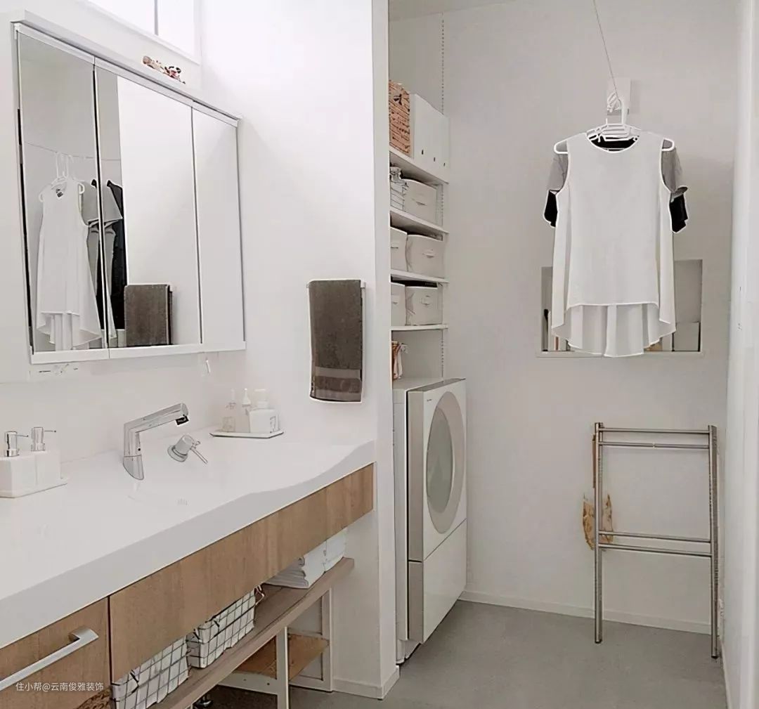 如果卫生间外面预留的空间比较大,最好把洗衣机安装在洗手台旁,这样洗澡换下来的脏衣服可以直接丢进洗衣机里,比放在阳台上要方便许多。采光比较好的话,安装一根隐形晾衣架,洗好的衣服就近晾晒,家务效率会更高。