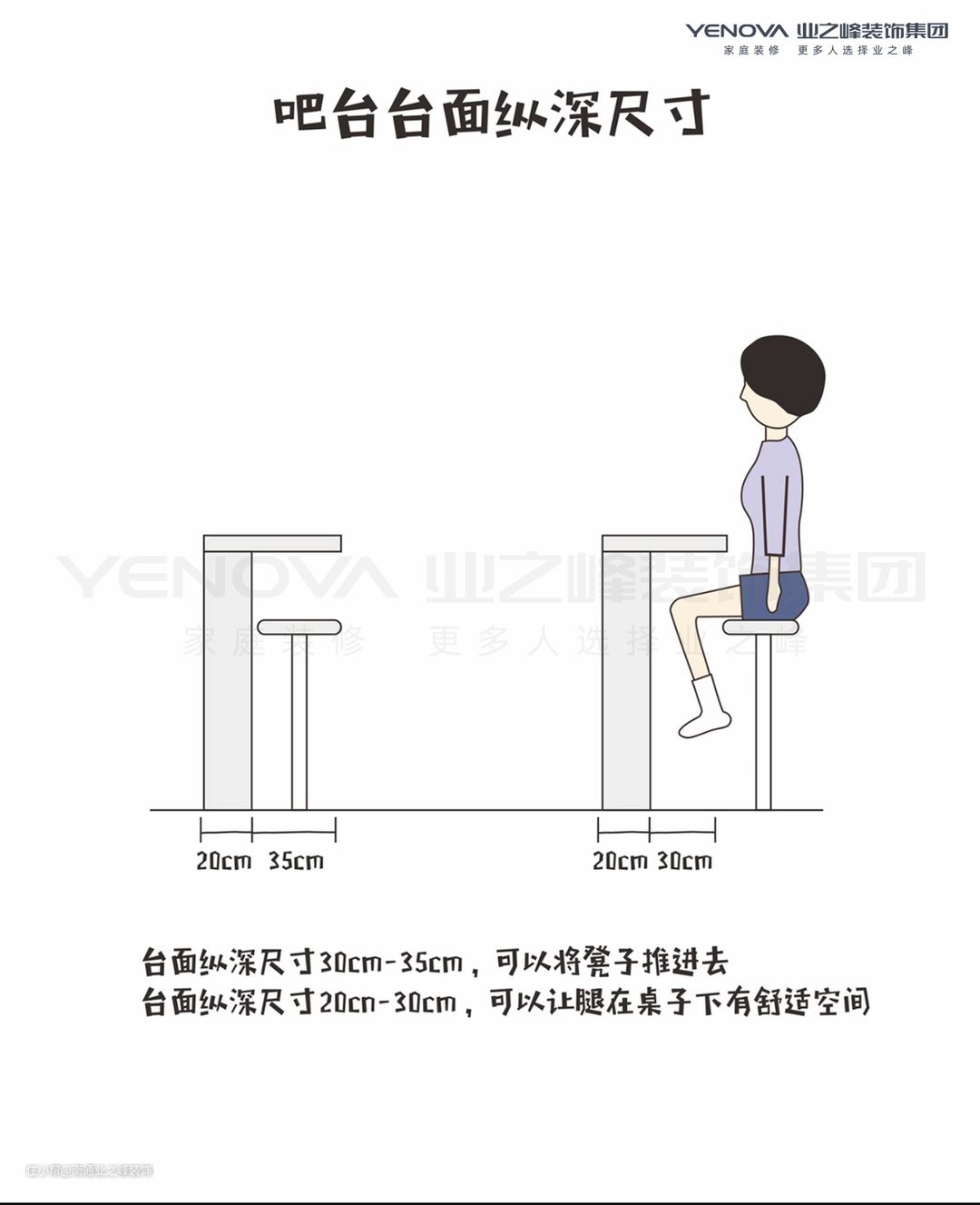 吧台台面的深度要根据吧台的功能而定,如果只喝饮料与用餐,那么台面的宽度就要大一些,如果台前预备有座位,台面就得突出吧台本身,因此台面深度至少要达到50厘米左右,这样一来,吧台下面就可以比较方便地储存物品了。