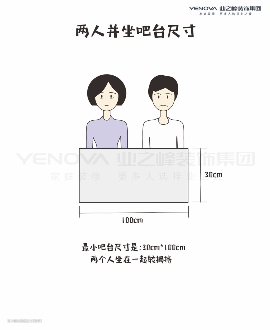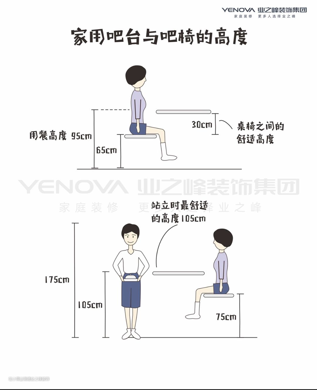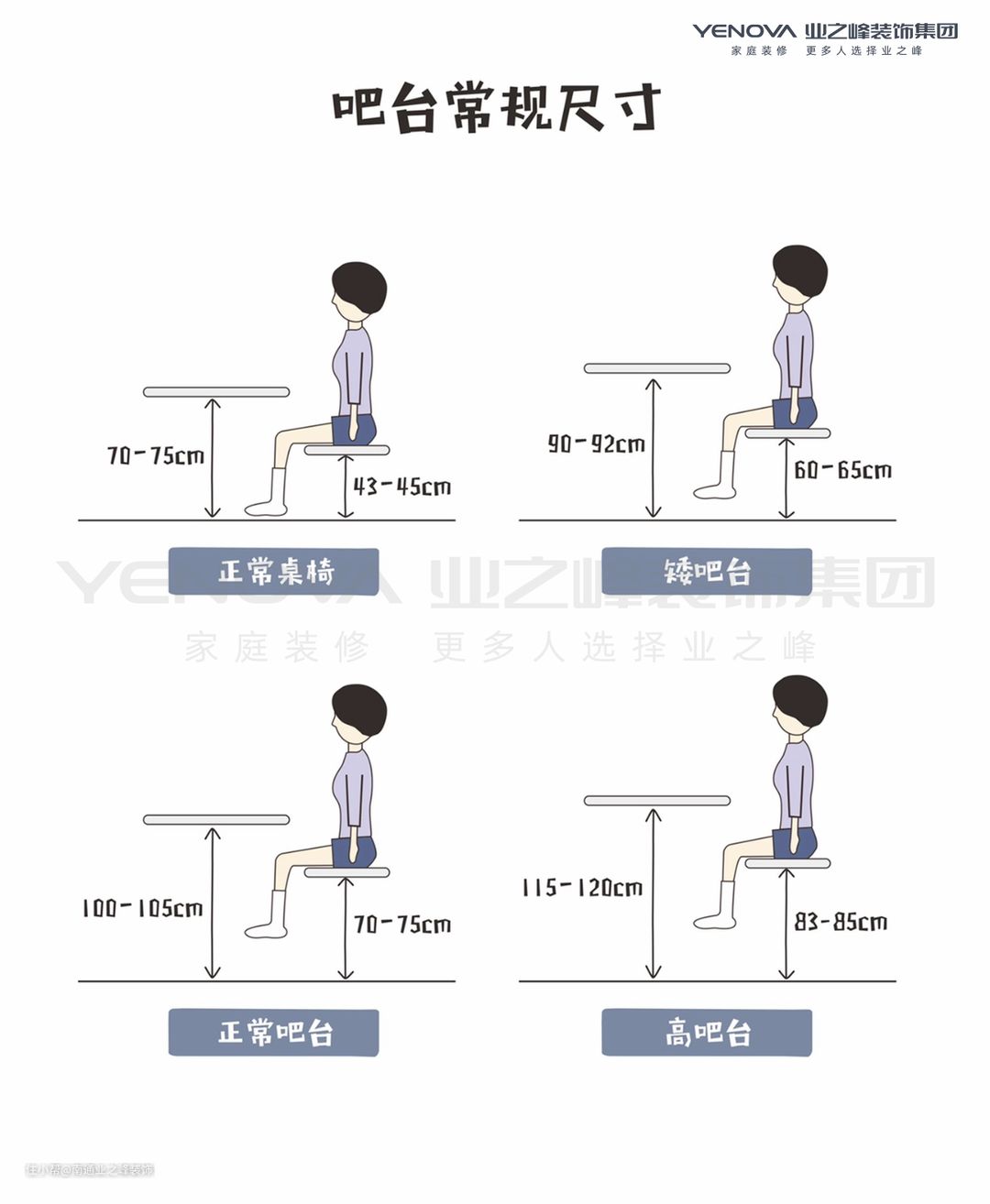 但一般家庭吧台高度大致为长180cm,宽120cm,高70cm。还有一种是双层吧台,它的高分别可以是105cm和80cm,第一层和第二层中间最好间隔25cm的宽度,这样我们才可以比较方便地放置各种物品。