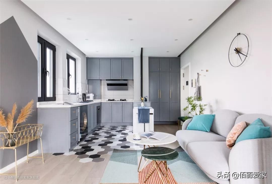 五角拼接的地砖在空间上划分了厨房区域。厨房与客厅之间有一张伸缩餐桌,不用时靠墙收起来,留出宽敞的活动空间。