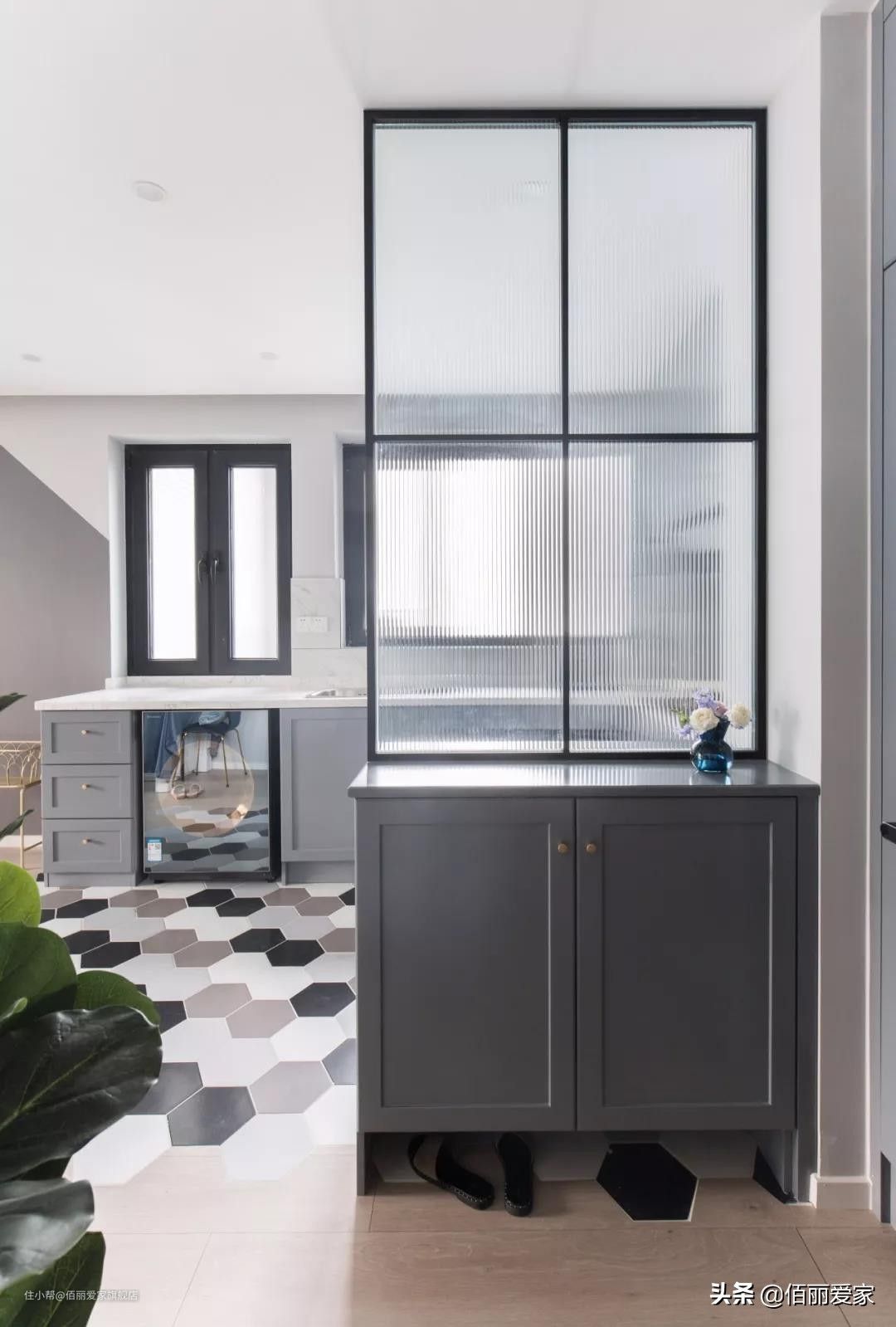 入户在右侧定制鞋柜+黑框玻璃屏风的组合,解决了玄关鞋子收纳的问题,还让鞋柜后方的开放式厨房保留了一定的隐私。